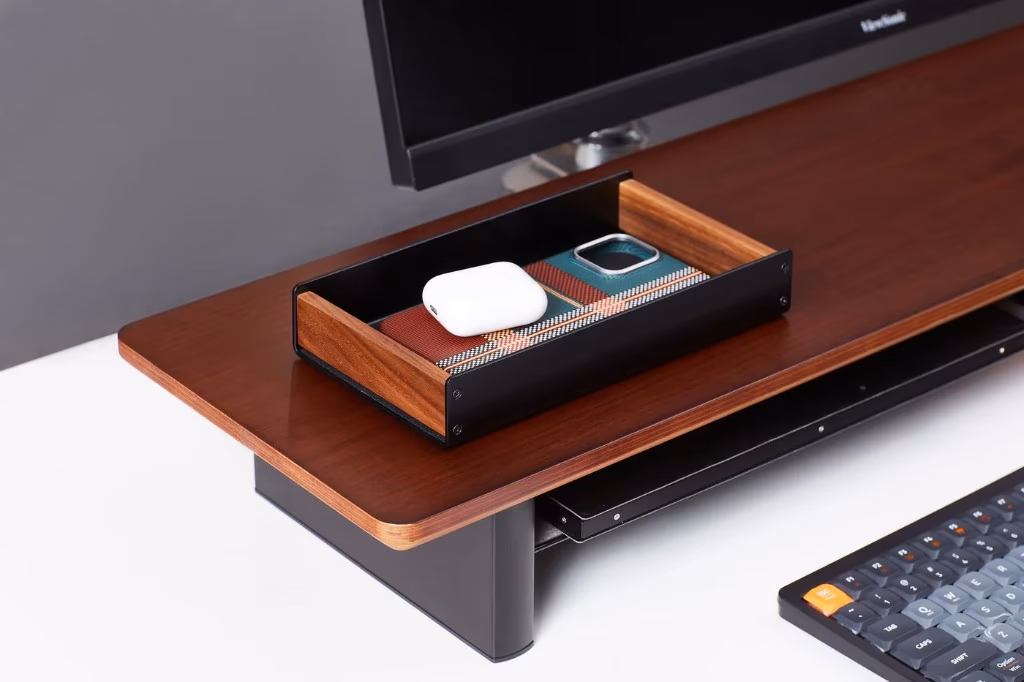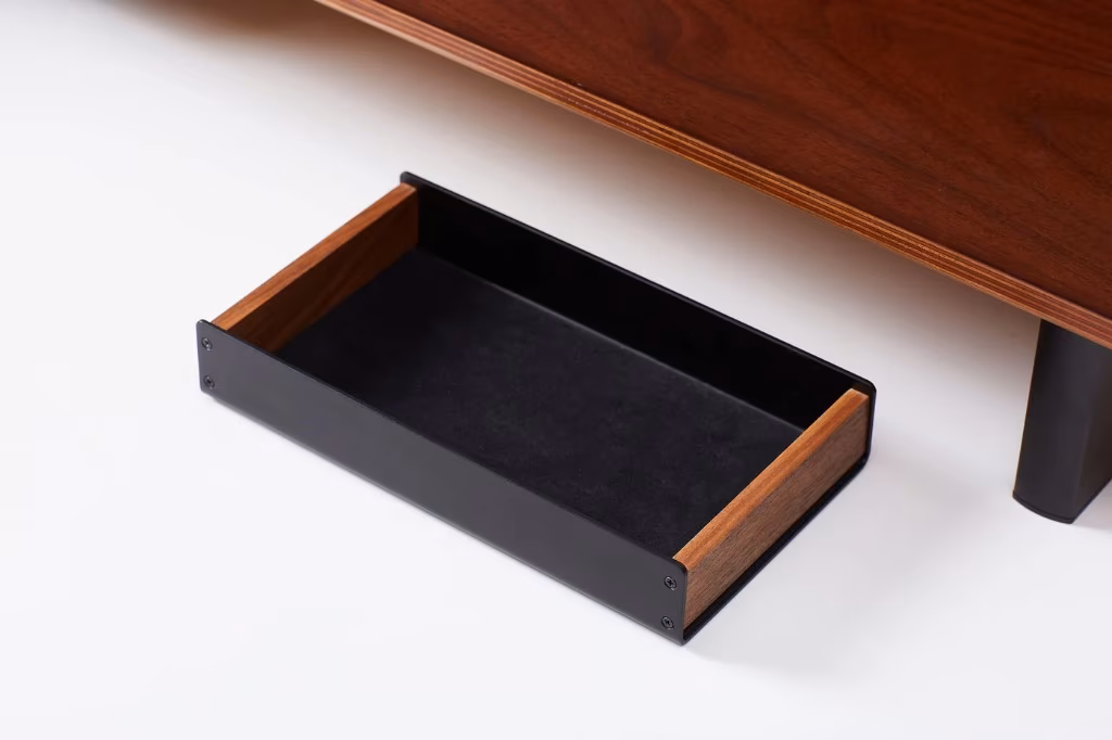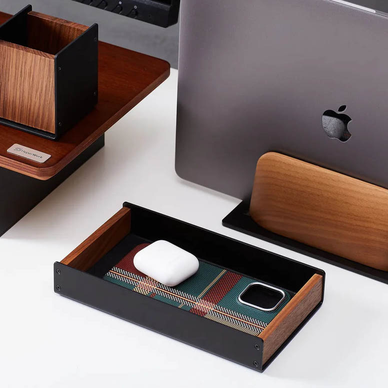 Khay để đồ HyperWork AT01 bằng gỗ óc chó tự nhiên kết hợp nhôm CNC, lót nhung chống xước, giúp sắp xếp gọn gàng keycaps và phụ kiện trên bàn làm việc.